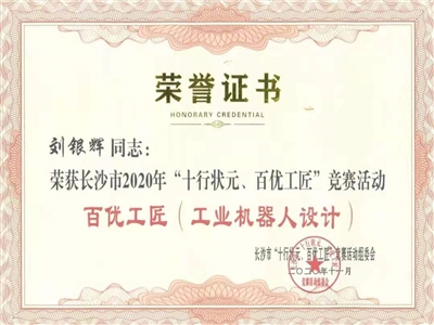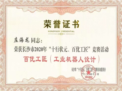 11月28日,長沙市總工會在市會議中心召開長沙市2020年“十行狀元、百優(yōu)工匠”技能競賽活動總結(jié)表彰會。長泰公司人工智能研究部莊海龍、智能裝備事業(yè)部劉銀輝組成的工業(yè)機(jī)器人設(shè)計(jì)小組被授予“百優(yōu)工匠”榮譽(yù)稱號!