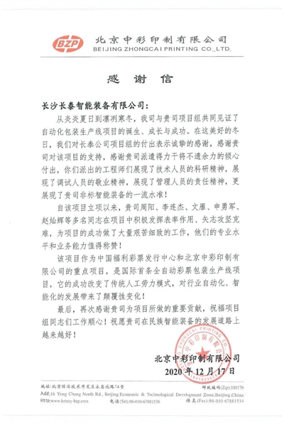 近期,長泰公司收到了來自客戶北京中彩印制有限公司的感謝信,對長泰公司項目實施團(tuán)隊的付出表示誠摯的感謝,贊揚長泰公司項目團(tuán)隊成員的科研精神、敬業(yè)精神和強(qiáng)烈的責(zé)任感,對長泰公司的智能裝備水平給予充分肯定!
