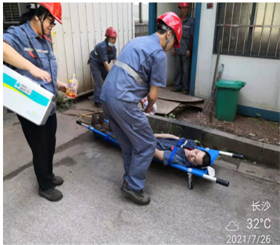 隨著生產(chǎn)部部長崔躍武一聲令下,演練活動正式開始!一名施工人員中暑暈倒,安全員發(fā)現(xiàn)險情后,立即通知相關(guān)負(fù)責(zé)人并撥打“120”急救電話,迅速將中暑員工抬至陰涼通風(fēng)處進(jìn)行物理降溫,解開中暑人員上衣、冷敷、扇風(fēng)、補(bǔ)充水分等,等待救援。