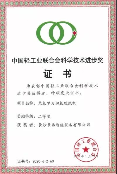 中國(guó)輕工業(yè)聯(lián)合會(huì)科學(xué)技術(shù)進(jìn)步獎(jiǎng)是由中國(guó)輕工業(yè)聯(lián)合會(huì)設(shè)立的最高輕工科技獎(jiǎng)項(xiàng),屬于國(guó)家部級(jí)科技獎(jiǎng)勵(lì),被認(rèn)為是輕工業(yè)的“榮譽(yù)勛章”。長(zhǎng)泰公司漿板單刀切板理紙機(jī)榮獲中國(guó)輕工業(yè)聯(lián)合會(huì)科學(xué)技術(shù)進(jìn)步獎(jiǎng)二等獎(jiǎng),充分體現(xiàn)了中國(guó)輕工業(yè)聯(lián)合會(huì)以及社會(huì)各界對(duì)該產(chǎn)品技術(shù)創(chuàng)新的認(rèn)可。