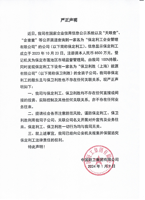 近日,我司在國家企業(yè)信用信息公示系統(tǒng)以及“天眼查”、“企查查”等公開渠道查詢到一家名為“保定利工企業(yè)管理有限公司”的公司(以下簡稱保定利工)。信息顯示保定利工成立于2023年10月23日,注冊資本人民幣8500萬元,登記機關(guān)為保定市蓮池區(qū)市場監(jiān)督管理局,由我司100%持股。同時發(fā)現(xiàn)保定利工下設(shè)有一家名為“保衛(wèi)利勝(上海)能源有限公司”(以下簡稱保衛(wèi)利勝)的全資子公司。我司非保定利工的股東且與保衛(wèi)利勝也不存在任何關(guān)聯(lián)關(guān)系,現(xiàn)嚴(yán)正聲明如下: