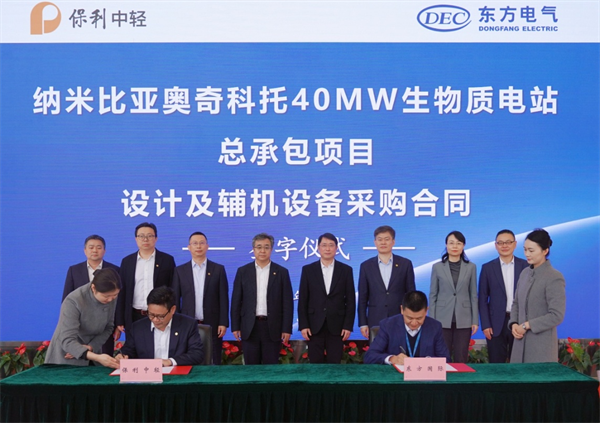 保利中輕副總經(jīng)理、中國海誠董事長趙國昂與東方國際副總經(jīng)理周杰代表雙方簽署戰(zhàn)略合作協(xié)議。中國海誠副總裁羅軍與東方國際機(jī)電事業(yè)部總經(jīng)理杜曉東代表雙方簽署納米比亞奧奇科托40MW生物質(zhì)電站總承包項(xiàng)目設(shè)計(jì)及輔機(jī)設(shè)備采購合同。簽約儀式前,雙方就深化合作深入友好交流。