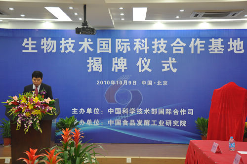 揭牌儀式上,靳曉明司長和陳鄂生董事長分別致辭。靳司長指出,科技的靈魂在于開放,食品行業(yè)作為國民經(jīng)濟的重要支柱產(chǎn)業(yè),技術(shù)的進步離不開國際合作。希望以設(shè)立生物技術(shù)“國際科技合作基地”為契機,積極參加國際科技合作交流活動,充分利用國際資源,進一步挖掘潛力,引進高級人才,使基地真正成為“技術(shù)領(lǐng)先、人才聚集”的國際科技創(chuàng)新中心。陳董事長要求,食品發(fā)酵院要深刻領(lǐng)會科技部《“十一五”國際合作規(guī)劃綱要》精神,緊密圍繞建設(shè)創(chuàng)新型國家的總體目標(biāo),切實提高自主創(chuàng)新能力,建設(shè)“項目基地人才”一體化的國際科技研發(fā)高地。蔡院長代表基地建設(shè)單位發(fā)表講話。